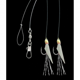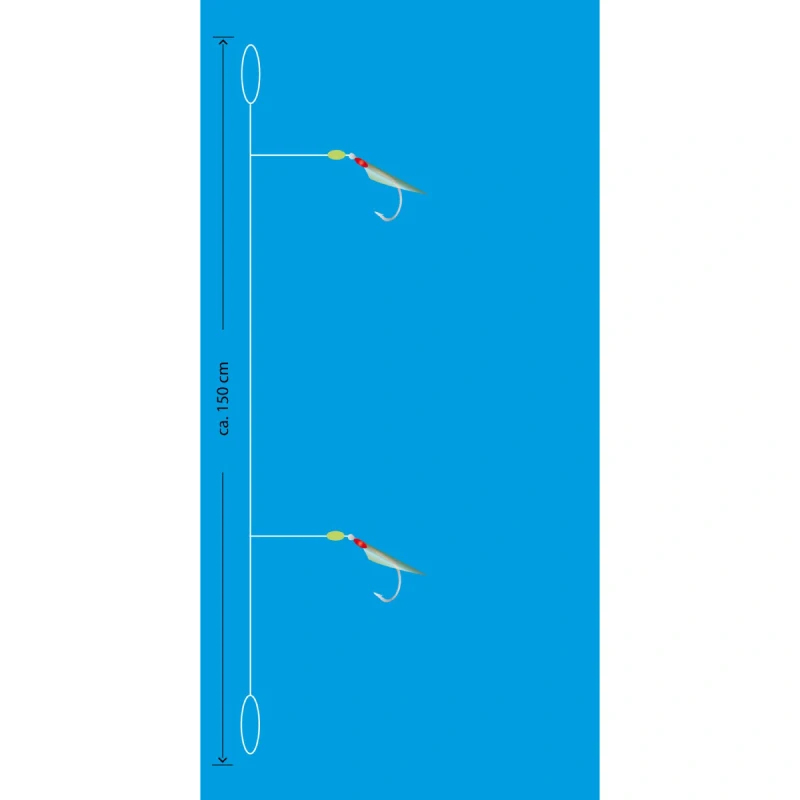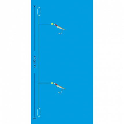 Mořský návazec se dvěma háčky velikost 14 potaženými pravou rybí kůží v přírodní barvě natural. Ideální pro lov menších mořských ryb, kdy ryby reagují na přirozený vzhled. Hlavní vlasec 0,35 mm, přívěs 0,30 mm, délka 150 cm, nosnost 6 kg.