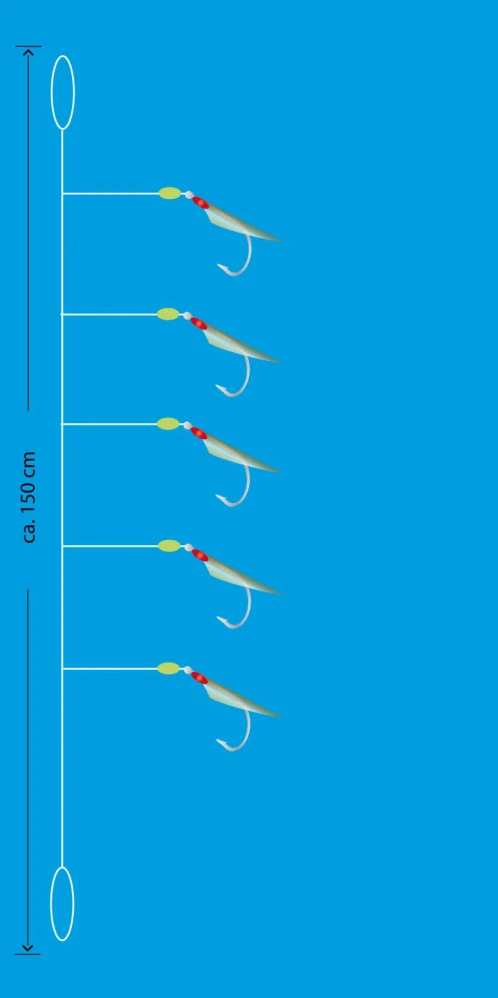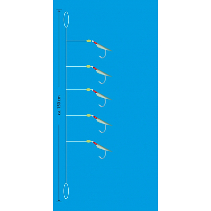 Mořský návazec s pěti háčky velikost 14 potaženými pravou rybí kůží v barvě natural. Ideální pro lov menších mořských ryb v čisté vodě. Hlavní vlasec 0,35 mm, přívěsy 0,30 mm, délka 150 cm, nosnost 6 kg.