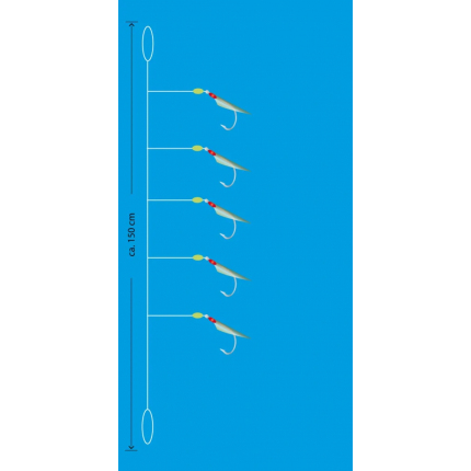 Kvalitní mořský návazec s pěti háčky velikost 4 potaženými pravou rybí kůží v přírodní barvě natural. Dokonale napodobuje vzhled i pohyb skutečné rybky. Hlavní vlasec 0,50 mm, přívěsy 0,45 mm, délka 150 cm, nosnost 12 kg.