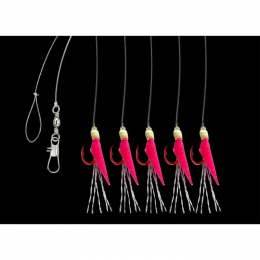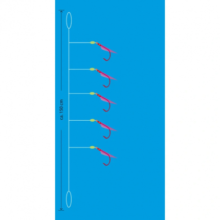 Kvalitní mořský návazec s pěti háčky velikost 4 potaženými pravou rybí kůží. Barva pink zajišťuje vysokou viditelnost i v hloubce a láká sleďe i makrely. Hlavní vlasec 0,50 mm, přívěsy 0,45 mm, délka 150 cm, nosnost 12 kg.
