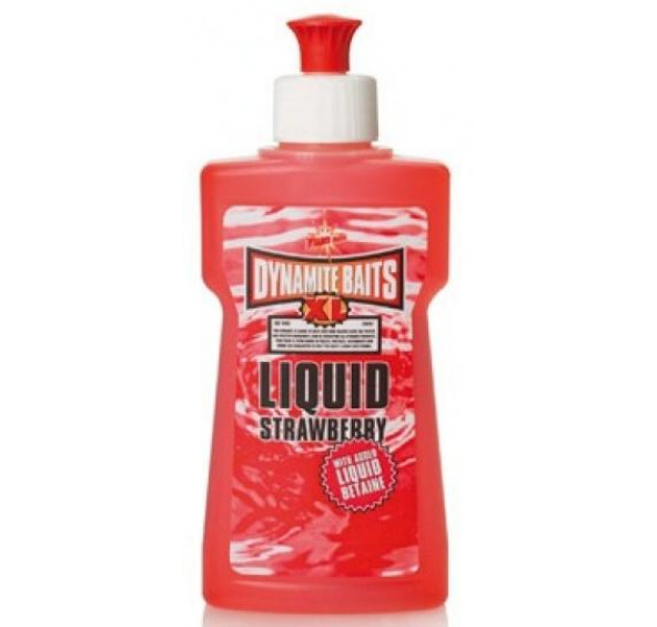 Dynamite Baits Liquid XL Strawberry 250ml - silné, tekuté aróma s príchuťou jahôd • Obohatené betaínom • Slúži na obohatenie Boilie, sypkých zmesí, peliet a háčkových návnad