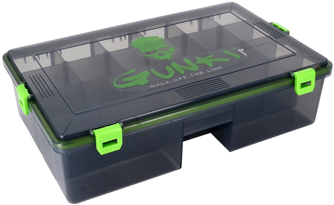 Vodotěsná krabička na nástrahy s nastavitelnými přihrádkami. Tmavá barva chrání nástrahy před dopady UV záření. Ideální pro použití v lodi nebo bellyboatu. Rozměr: 35,5x23x9 cm.