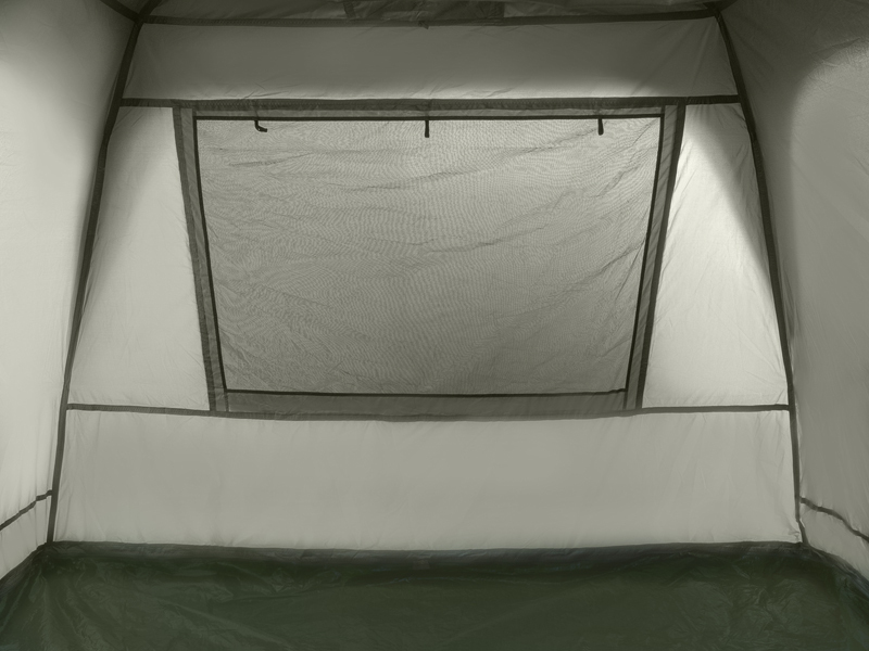 Veľkou devízou je dôkladne navrhnutý vetrací systém, pozostávajúci z niekoľkých okien a prekrytí, resp. „striešky“ bivaku. Rozmerné moskytiérové okno je umiestnené na prednom aj zadnom paneli, pričom štyri menšie okná sú umiestnené priamo na strope bivaku. Vďaka tomuto dôvtipnému systému je možné zabezpečiť cirkuláciu vzduchu vo vnútornom priestore aj v čase, keď nie je možné vetrať pomocou veľkých okien. Určite ho oceníte najmä v noci, keď výrazne pomáha znižovať kondenzáciu na vnútorných stenách. Súčasťou samotnej striešky je aj veľký šilt, ktorý poskytuje dodatočnú ochranu pred slnkom a dažďom. Strieška je ku konštrukcii upevnená množstvom úchytov tak, aby bola čo najviac eliminovaná možnosť podfúknutia pri silnejšom vetre. K stabilite vo veternom počasí prispievajú aj 4 stabilizačné šnúry a kolíky, ktoré sú súčasťou balenia.