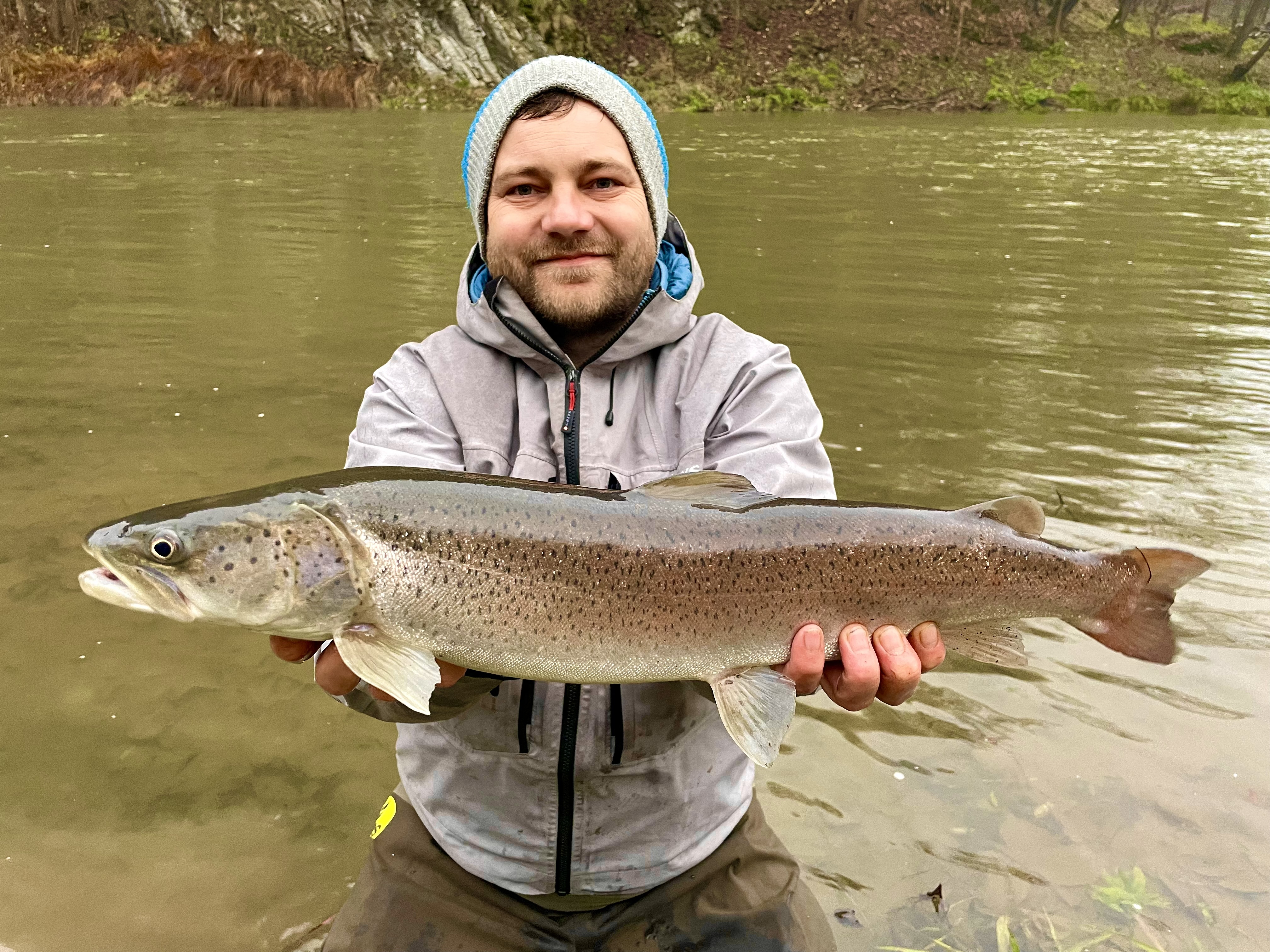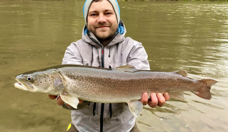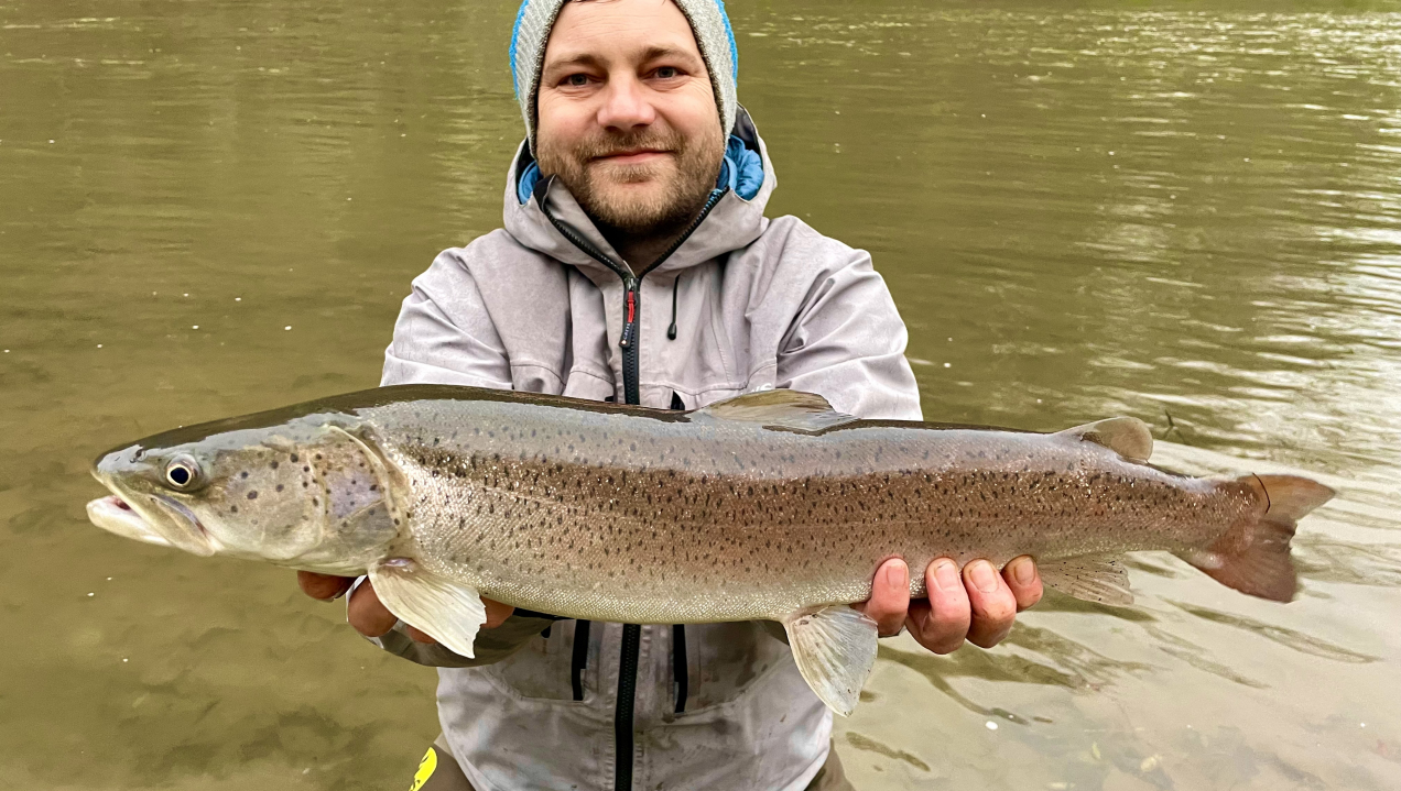 Poslední ráno už jdeme skoro po paměti. Unavení, promrzlí, ale stále ještě odhodlaní. V jednom proudku pod skalou dostávám záběr na woblera v barvě pstruha a konečně mám na prutě rybu! Od začátku vím že nebude velká a zdolání trvá jen chvilku. Mám hlavatku! Není největší, zatím to ještě není královna, ale pro nás je první! A první je jen jedna. Máme radost, chceme další rybu, ale do večera už nic nepřichází. Pomalu balíme a chystáme se na cestu zpět domů.