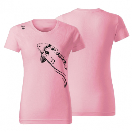 Kvalitné dámske tričko v ružovej farbe s naším originálnym dizajnom vyplávajúceho kapra v prednej časti....