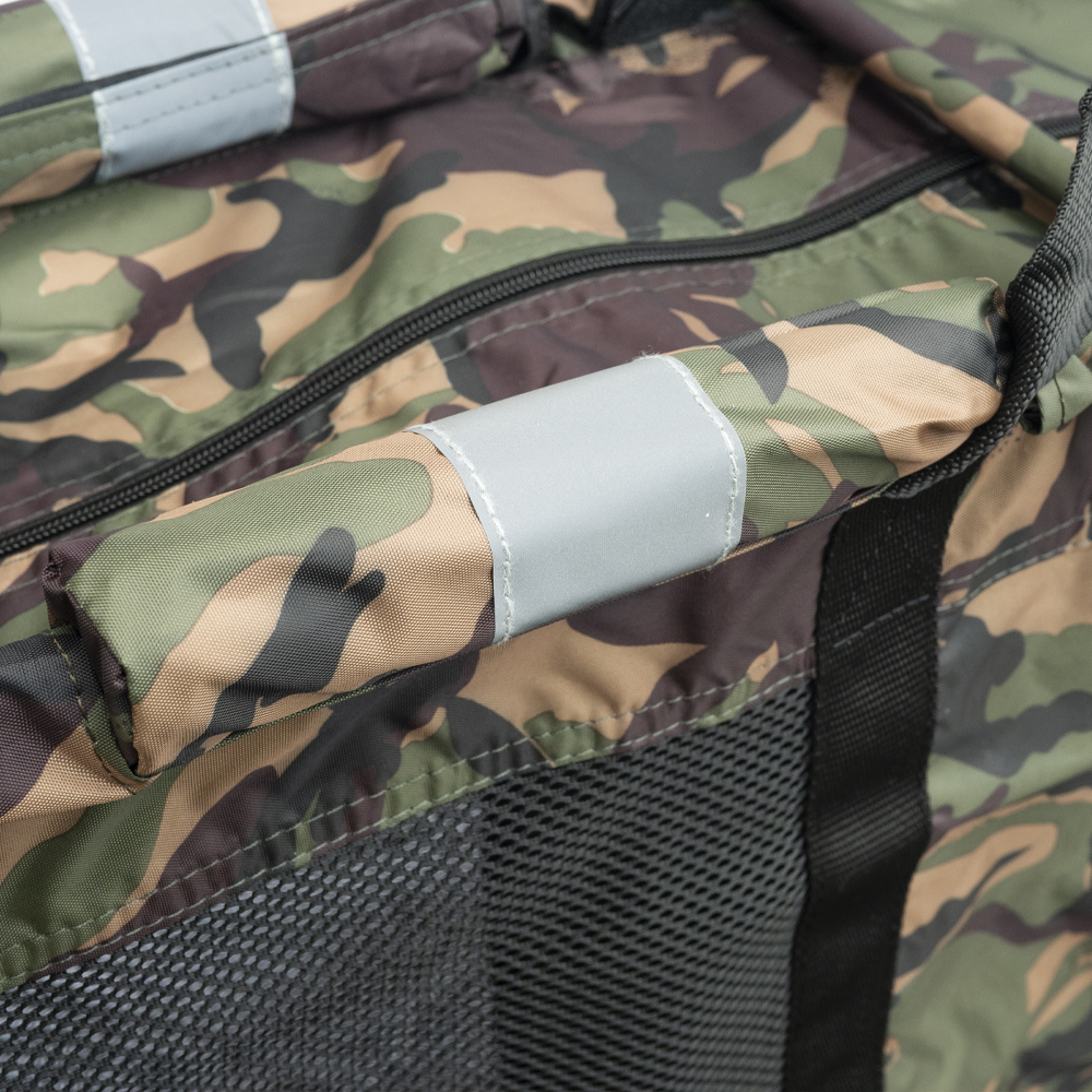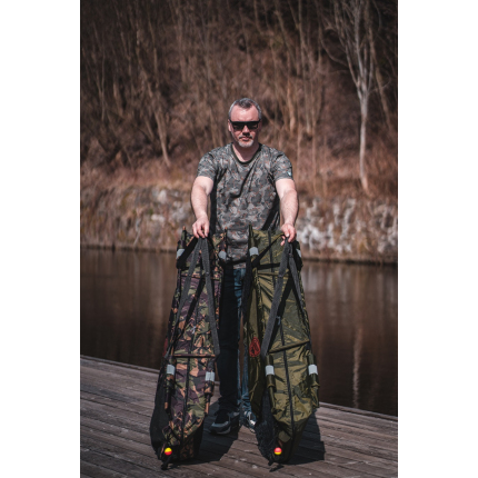Veľký a prepracovaný vážiaci sak, v ktorom môžete bezpečne tiež prechovávať svoj úlovok. Vážiaci sak má štyri plaváky, ktoré majú reflexné pásky pre ľahkú viditeľnosť v noci. Vo vrchnej centrálnej časti je dvojitý popruh, ktorý je zakončený oceľovými krúžkami a je určený na pripojenie váhy. Dvojité zipsy sú po celej dĺžke. Veľký dôraz, bol kladený na sieťové otvory, aby k úlovku prúdil dostatok prekysličenie vody. Z oboch bokov saku sú plastové „D“ krúžky, na ktoré je možné pripojiť 3m lano, ktoré je zakončené plavákom s plastovým kolíkom, ktorý je určený na zabezpečenie saku pri brehu. To všetko je ukryté v kapsičke na suchý zips. Je dodávaný vrátane nepremokavého obalu, ktorý je zvnútra pogumovaný, takže zabráni úniku vody a pachu zo saku. Rozmery: Dĺžka: 120 cm Šírka: 29 cm Výška 65 cm Hmotnosť: 1,1 kg Farba: maskáčový vzor