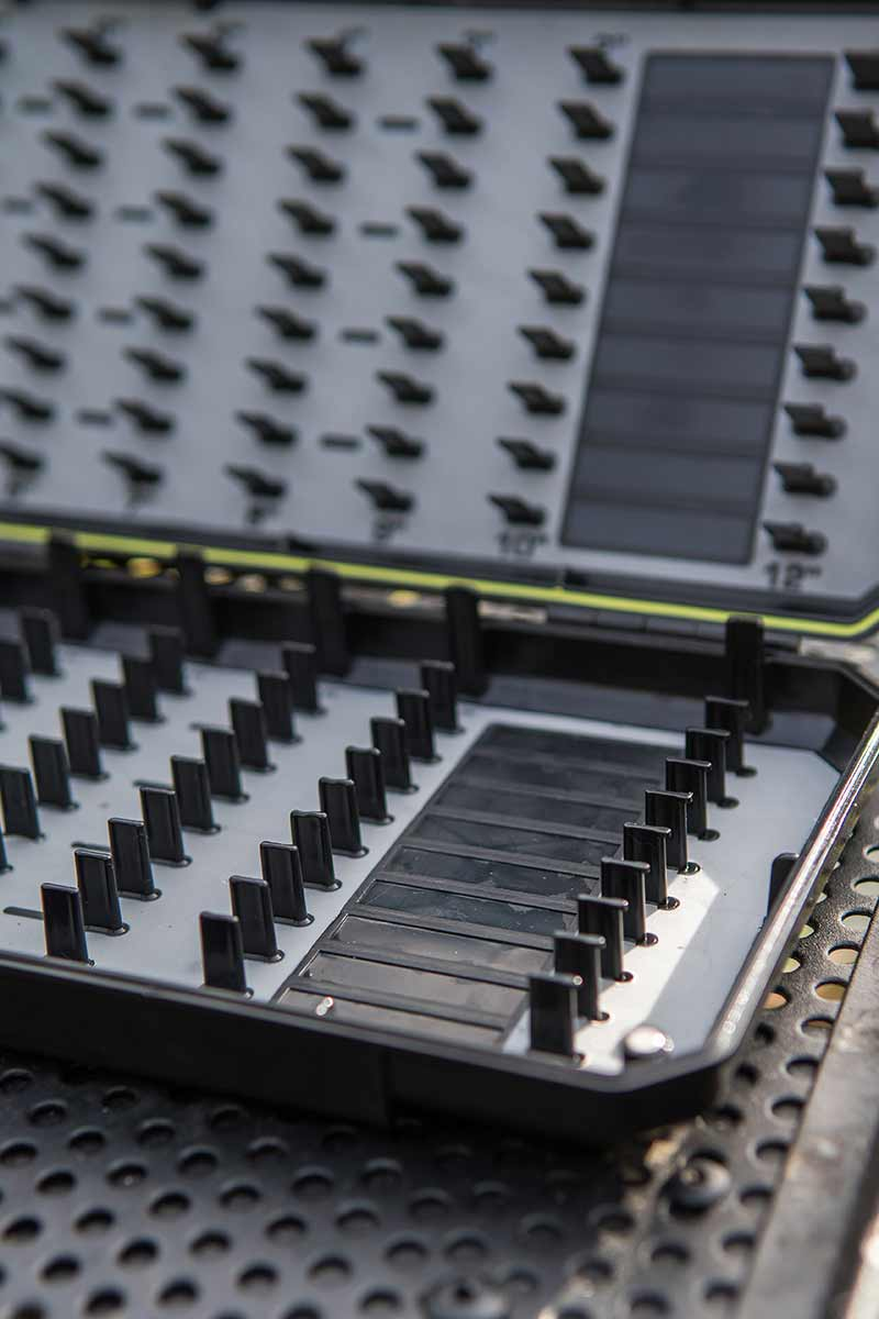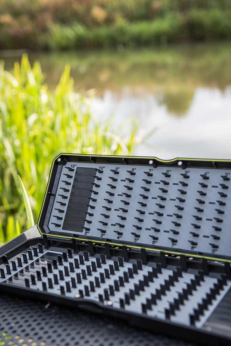 Dlhé puzdro na nadväzce ideálne pre nadväzce v dĺžke 5 a 60 cm 36 kolíčkov na háčiky každý až pre 10 háčikov (360 háčikov celkom). Kratšie nadväzce možno uložiť na oboch koncoch puzdra pre maximálnu kapacitu Nadväzce dlhšie ako 30 cm možno ohnúť okolo koncového kolíka Vnútorné meracie kolíky pre presné určenie potrebnej dĺžky nadväzca. Gumový povla...