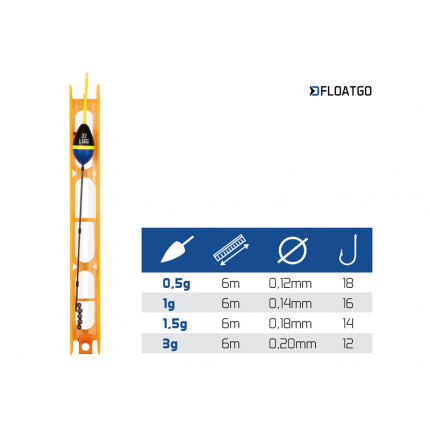 Kompletný systém o dĺžke 6m určený na lov na bič, zahŕňajúci plavák v tvare slzy v gramážach 0,5-3g, vyvážený brokmi a ukončený nadväzcom s malým lopatkovým háčikom. Celá montáž je navinutá na farebnom rebríčku, takže stačí priviazať vlasec na špičku biča, vyrolovať z rebríčka a lov môže začať. Po ukončení lovu je teda možné ju odopnúť, narolovať späť a odložiť do tašky. FloatGO možno použiť aj pri love na bolonézový alebo match prút ako predpripravený nadväzec.