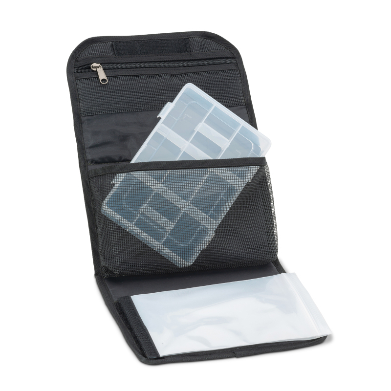 Malé, vreckový puzdro pre uloženie vybavenia a materiálu na výrobu náväzcov a samozrejme tiež priestor pre ich uskladnenie. Súčasťou je tiež plastová škatuľka, do ktorej si môžete svoje veci prehľadne porovnať. To vám pri vode ušetrí veľa času, ktorý môžete venovať rybárčenie.