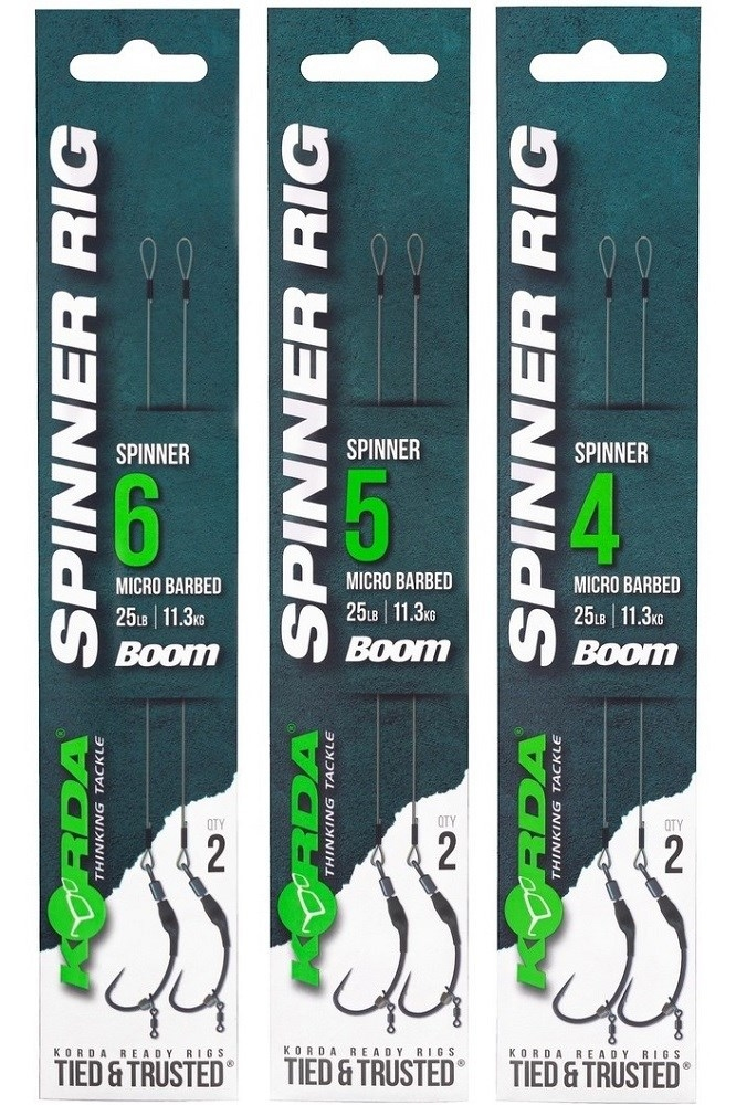 Náväzec Ready Tied Spinner Rig obsahuje 5,5” Boom sekciu a teraz prichádza s tromi typmi háčikov; Krank, Kurv Shank a najnovšia verzia v stajni Korda, Spinner Hook. Všetky sú dostupné vo verziách s protihrotom alebo bez protihrotu, veľkosti 4 až 6.