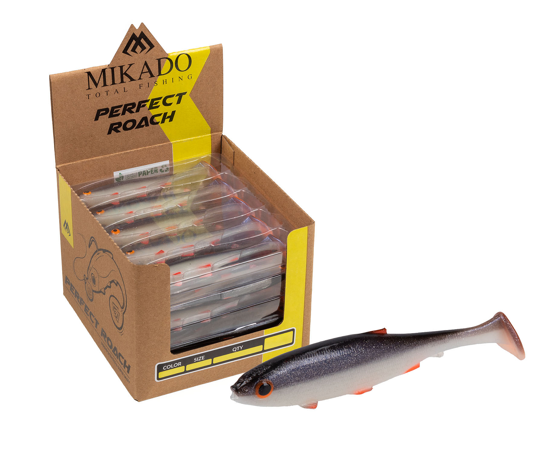 Perfect Roach je nástraha, která si už při prvních testech získala uznání rybářů po celém světě díky své neobyčejné účinnosti při lovu candátů, okounů, štik a bolenů. Kombinace správně zvolené směsi ekologického a měkkého silikonu bez ftalátů (Phthalates free), spolu s ručním lakováním nejvyšší kvality, umožnila firmě Mikado vytvořit nejvěrnější imitaci plotice, jaká je na trhu dostupná. Nástraha se vyznačuje vynikající prací v jakýchkoli podmínkách, bez ohledu na použitou hmotnost jigové hlavičky, díky čemuž žádný dravec kolem ní nepropluje lhostejně!