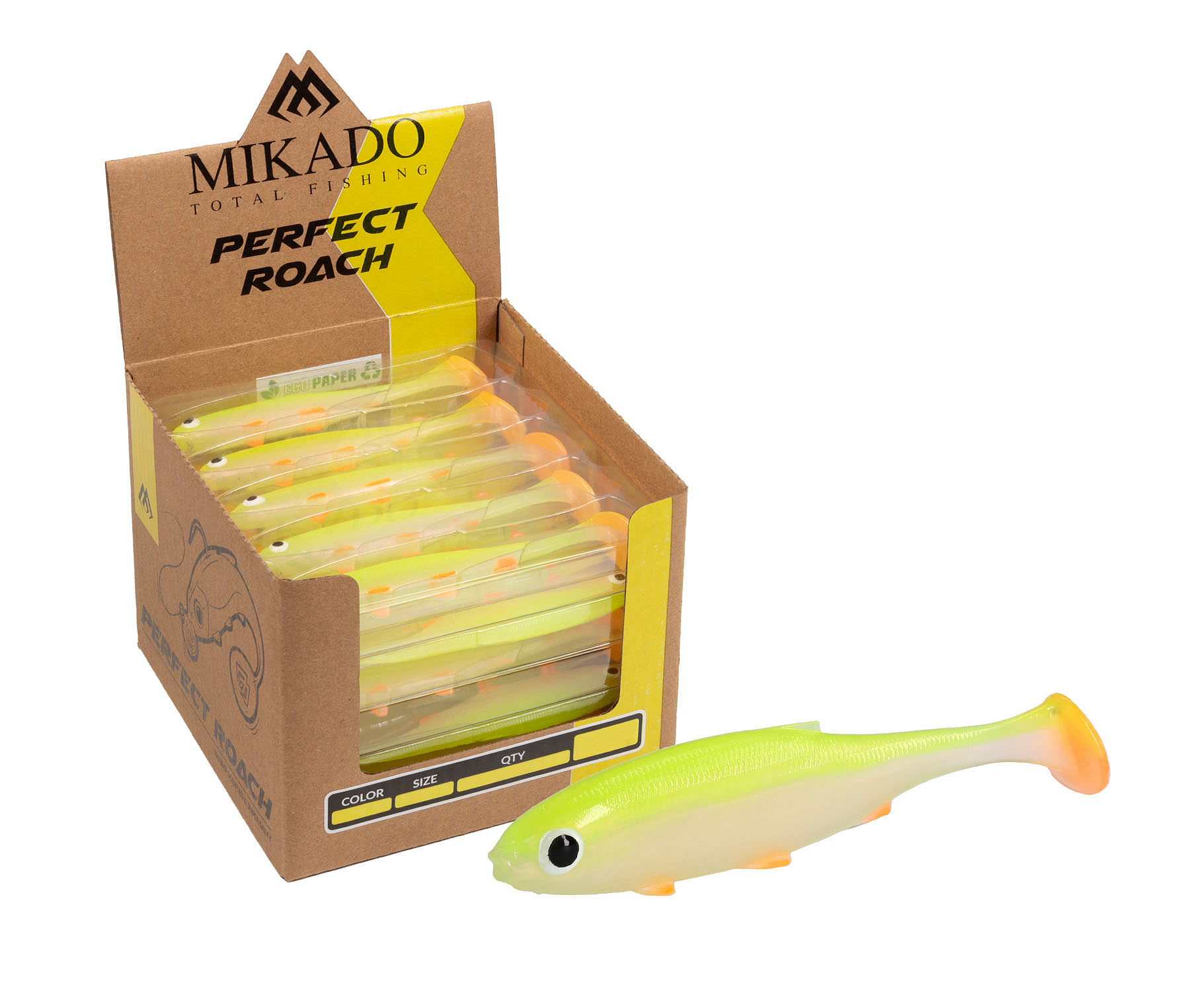 Perfect Roach je nástraha, která si už při prvních testech získala uznání rybářů po celém světě díky své neobyčejné účinnosti při lovu candátů, okounů, štik a bolenů. Kombinace správně zvolené směsi ekologického a měkkého silikonu bez ftalátů (Phthalates free), spolu s ručním lakováním nejvyšší kvality, umožnila firmě Mikado vytvořit nejvěrnější imitaci plotice, jaká je na trhu dostupná. Nástraha se vyznačuje vynikající prací v jakýchkoli podmínkách, bez ohledu na použitou hmotnost jigové hlavičky, díky čemuž žádný dravec kolem ní nepropluje lhostejně!