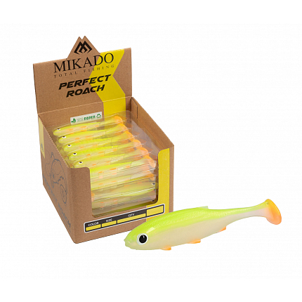 Perfect Roach je nástraha, která si už při prvních testech získala uznání rybářů po celém světě díky své neobyčejné účinnosti při lovu candátů, okounů, štik a bolenů. Kombinace správně zvolené směsi ekologického a měkkého silikonu bez ftalátů (Phthalates free), spolu s ručním lakováním nejvyšší kvality, umožnila firmě Mikado vytvořit nejvěrnější imitaci plotice, jaká je na trhu dostupná. Nástraha se vyznačuje vynikající prací v jakýchkoli podmínkách, bez ohledu na použitou hmotnost jigové hlavičky, díky čemuž žádný dravec kolem ní nepropluje lhostejně!