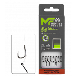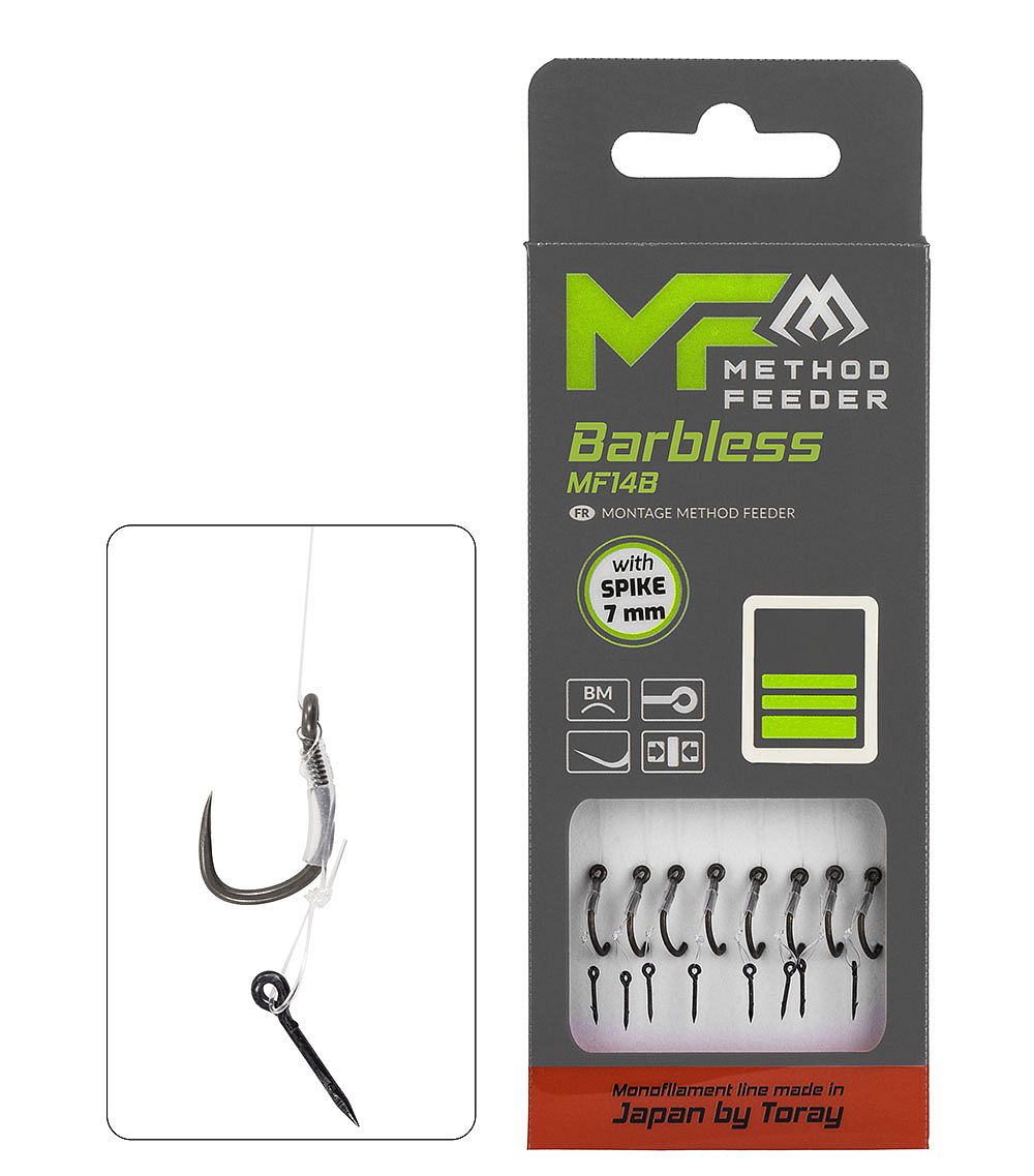Hotové method návazce na háčcích MF14 bez protihrotu. Extrémně ostré, pevné, s koncem Push Stop, gumička nebo trn. Na pletené šňůře i monofil....