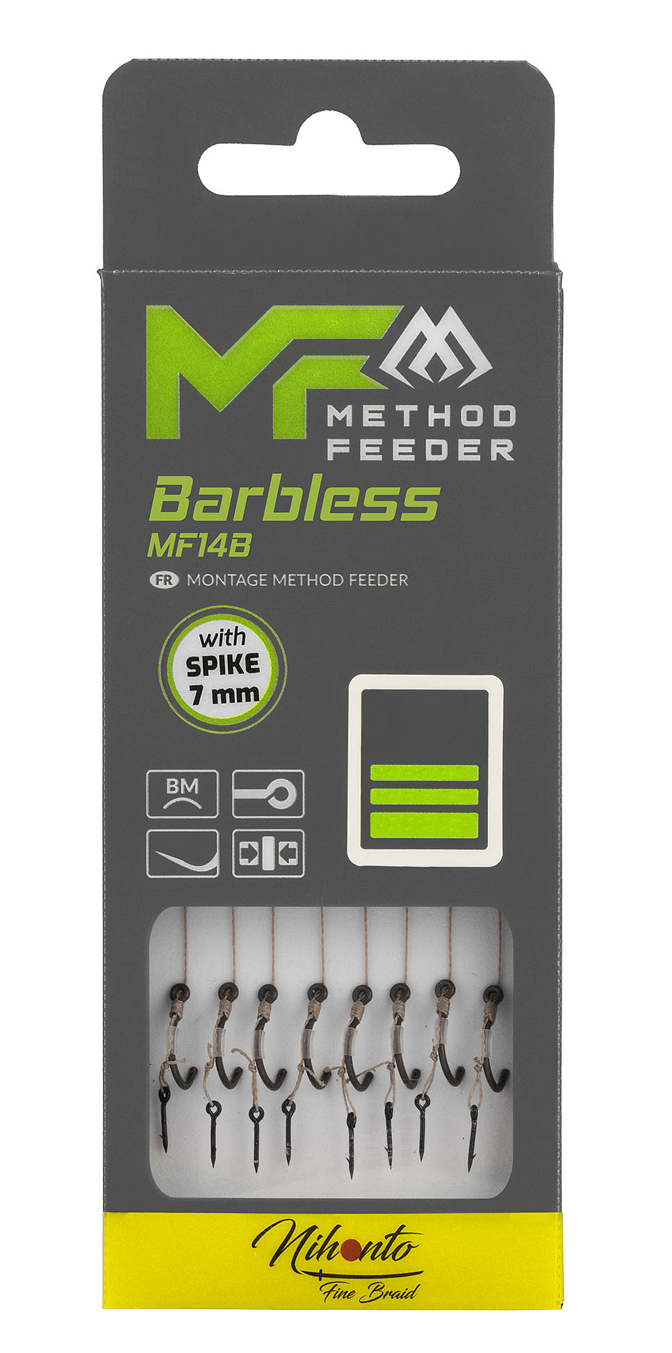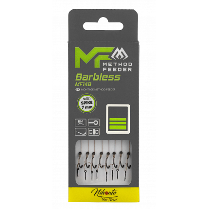 Hotové method návazce na háčcích MF14 bez protihrotu. Extrémně ostré, pevné, s koncem Push Stop, gumička nebo trn. Na pletené šňůře i monofil.