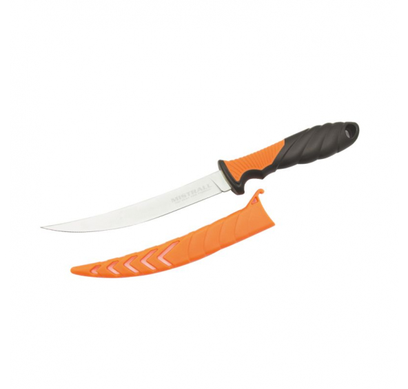 Kvalitný filetovací nôž s oranžovým puzdrom.