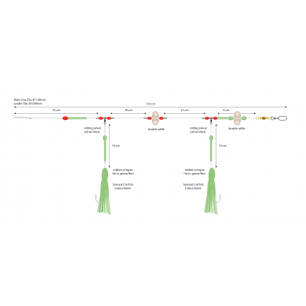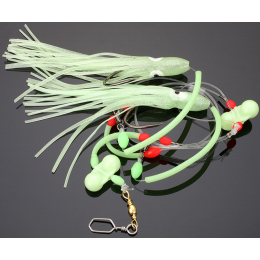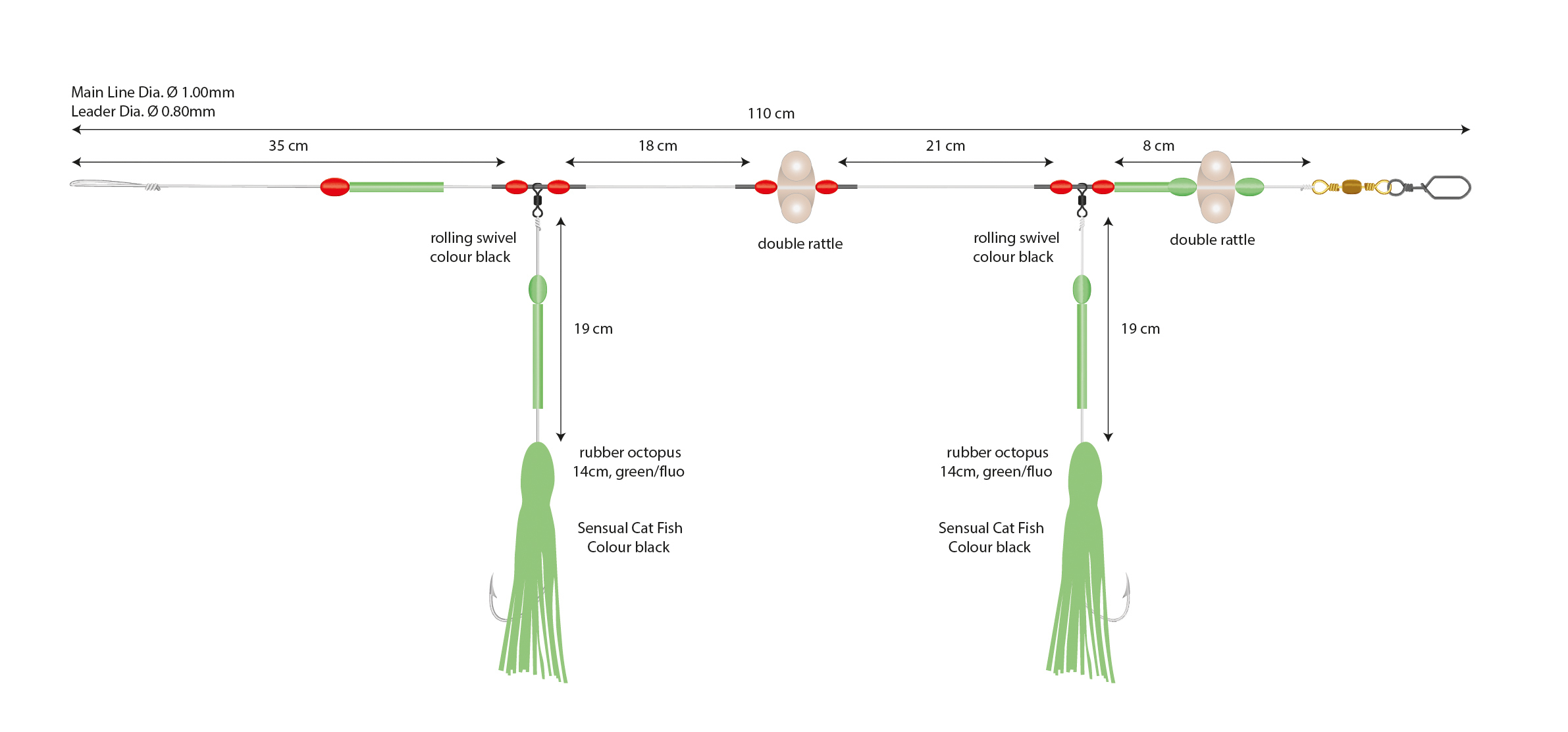Montáž na lov nórskeho vlkouša (kočky) s fluorescenčnou chobotnicou a rolničkou pre ľahké nájdenie nástrahy. Vhodná pre filety a lov s veľkou záťažou v hĺbkach 50-100 m. Ideálne pre "mačky" a veľké mníky....