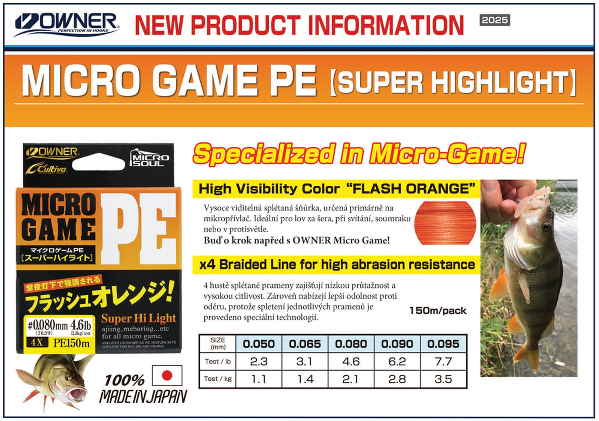 OWNER MICRO GAME PE Super Highlight je špičková čtyřpramenná pletená šňůra určená pro ultralehkou přívlač.~Vyvinuta byla pro rybáře, kteří chtějí maximální citlivost, přesnost a kontrolu nástrahy i při nejjemnějších záběrech.~~Díky výrazné barvě Flash Orange je šňůra skvěle viditelná za šera, při lovu proti světlu nebo v odrazu hladiny.~Snadno tak poznáte každý dotek ryby i jemný pohyb nástrahy.~~Čtyřnásobné pletení zajišťuje vysokou odolnost proti oděru, minimální průtažnost a dlouhou životnost.~Perfektní volba pro lov okounů, pstruhů, tloušťů nebo candátů s lehkými nástrahami.~~Hlavní vlastnosti:~Průměr a nosnost: 0.09 mm / 2.8 kg~Vysoce viditelná barva Flash Orange pro lepší kontrolu záběru~4× pletená konstrukce s hladkým povrchem~Nízký průtah a maximální citlivost~Výborná odolnost vůči oděru~Vhodná pro ultralehkou přívlač (UL, light spinning)~Délka návinu: 150 m~~Vyrobeno v Japonsku ~~Dostupné průměry a nosnosti:~0.05 mm / 1.1 kg~0.065 mm / 1.4 kg~0.08 mm / 2.1 kg~0.09 mm / 2.8 kg~0.095 mm / 3.5 kg...