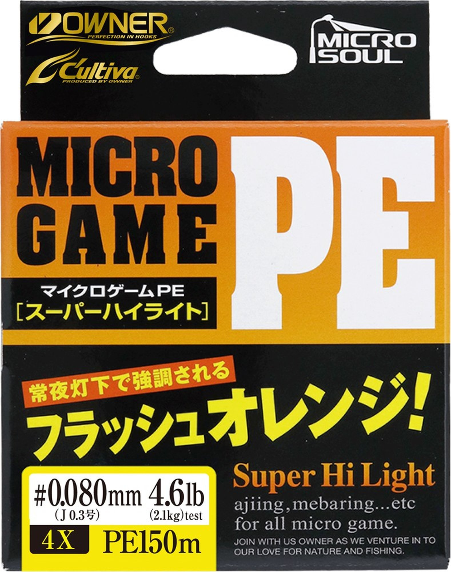 OWNER MICRO GAME PE Super Highlight je špičková čtyřpramenná pletená šňůra určená pro ultralehkou přívlač.~Vyvinuta byla pro rybáře, kteří chtějí maximální citlivost, přesnost a kontrolu nástrahy i při nejjemnějších záběrech.~~Díky výrazné barvě Flash Orange je šňůra skvěle viditelná za šera, při lovu proti světlu nebo v odrazu hladiny.~Snadno tak poznáte každý dotek ryby i jemný pohyb nástrahy.~~Čtyřnásobné pletení zajišťuje vysokou odolnost proti oděru, minimální průtažnost a dlouhou životnost.~Perfektní volba pro lov okounů, pstruhů, tloušťů nebo candátů s lehkými nástrahami.~~Hlavní vlastnosti:~Průměr a nosnost: 0.09 mm / 2.8 kg~Vysoce viditelná barva Flash Orange pro lepší kontrolu záběru~4× pletená konstrukce s hladkým povrchem~Nízký průtah a maximální citlivost~Výborná odolnost vůči oděru~Vhodná pro ultralehkou přívlač (UL, light spinning)~Délka návinu: 150 m~~Vyrobeno v Japonsku ~~Dostupné průměry a nosnosti:~0.05 mm / 1.1 kg~0.065 mm / 1.4 kg~0.08 mm / 2.1 kg~0.09 mm / 2.8 kg~0.095 mm / 3.5 kg