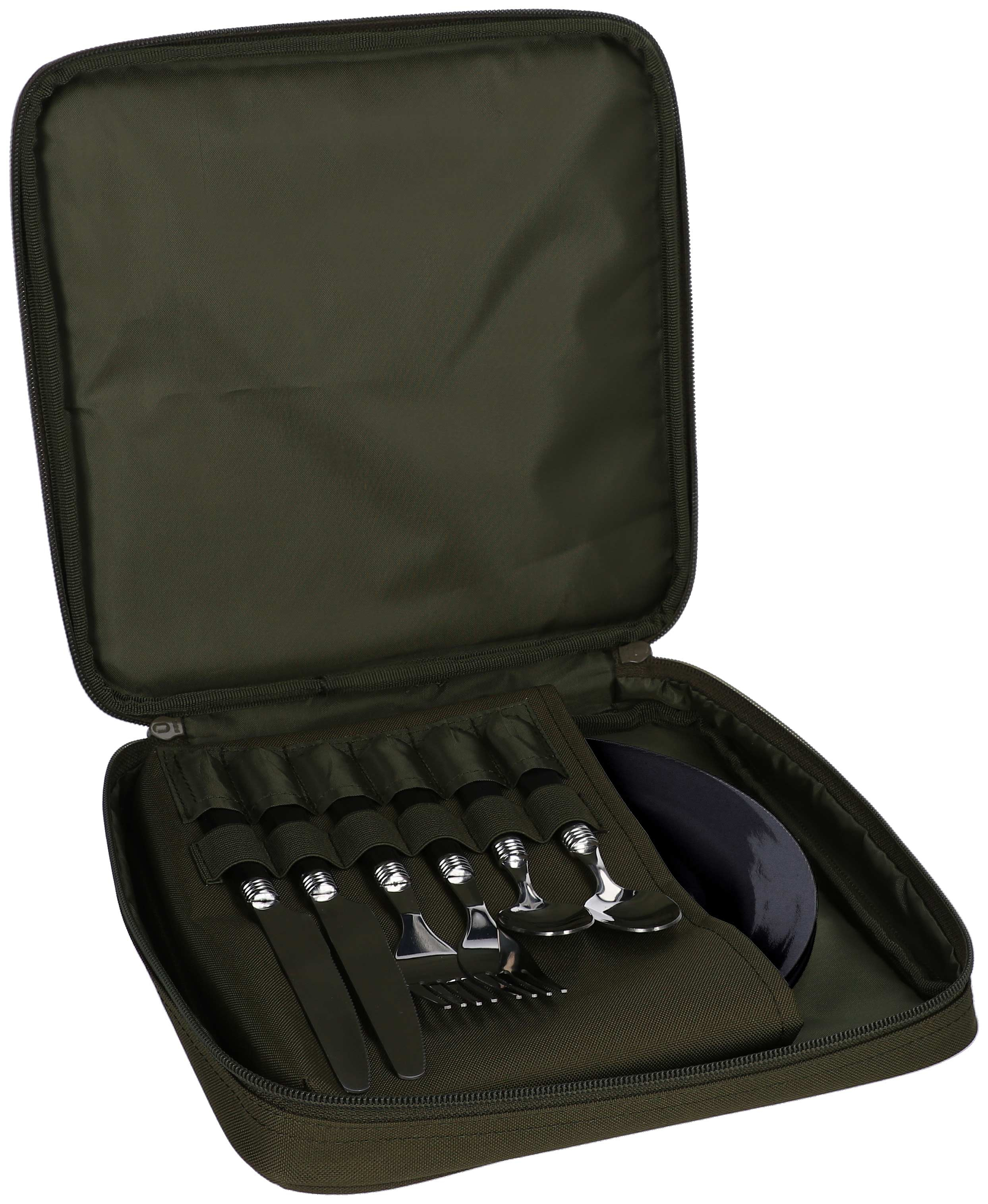Súprava obsahuje dva taniere, príbor (dva nože, dve vidličky, dve lyžice) a dobre vyzerajúce puzdro. Vynikajúca voľba pre akýkoľvek rybársky výlet.