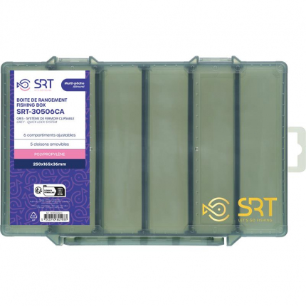 Šedé krabičky SRT-30506CA se 6 nastavitelnými přihrádkami, vyrobené z polypropylenu, jsou speciálně navrženy pro praktické a organizované uložení nástrah a dalšího příslušenství k rybářským potřebám....