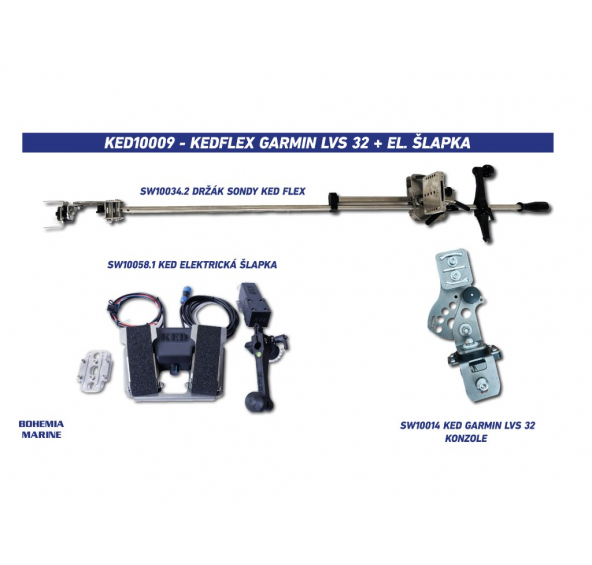 Součástí sestavy je nerezový držák sondy KedFlex, výměnná konzole KED Garmin LVS 32 a elektrická šlapka.