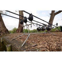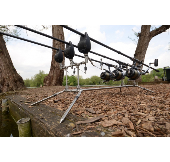 Ozubené kolesá micro-adjust umožňujú ovládať sklon jednotlivých nôh. Všimnite si aj nastaviteľné centrálne tyče, kompaktný dizajn a stabilitu, ktorá poskytuje stojanu maximálnu nehybnosť.