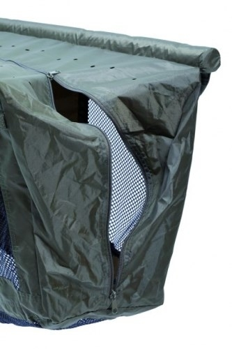 Horní část je zajištěná zipem, pojistka na klip. Mikrotkanina zabraňuje poškození ryby. Rybu pak lze ve vaku i zvážit díky pevné tyčové konstrukci. Madla pro snadnou manipulaci a přenos.