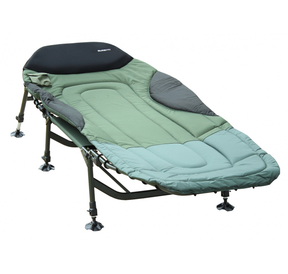 Exkluzívne lehátko s tromi pármi nôh. Široké polstrovanie chráni pred vetrom a zimou. Matrac je ušitá z veľmi pevného materiálu 600D Oxford-Nylonu s pridanou protišmykovou osnovou. Vankúš a boky sú z neoprénu a vankúš je navyše možné vybrať a v prípade potreby vysušiť. Nosnosť lehátka je dimenzovaná s rezervou do 135kg. Kompaktná konštrukcia, vystužené kĺby operadla a husté vinutie nosnej gumy to len potvrdzujú. Teleskopické nohy majú pružinový, ľahko ovládateľný zámok a protišmykovú podložku otočnou o 360 °. V základnej výbave je aj vrecko našitá na matrac na mobilný telefón alebo odposluch.