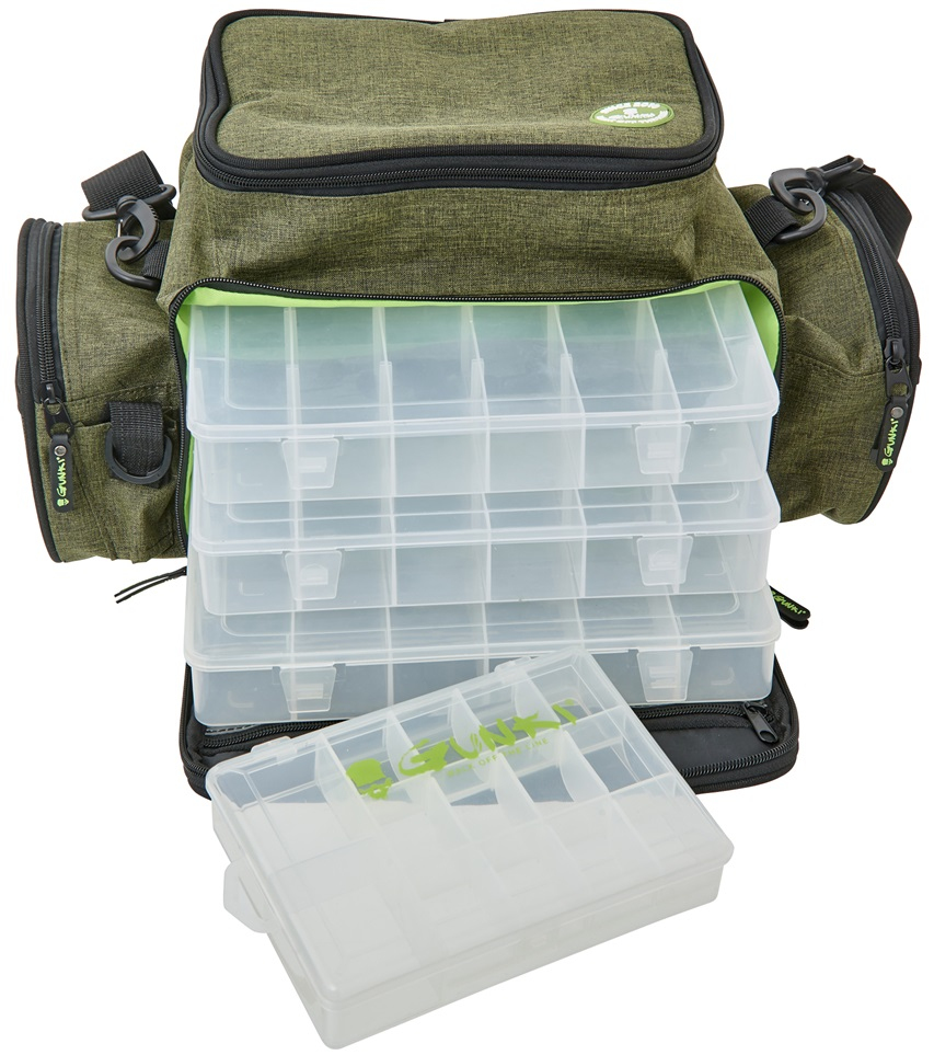 Celý popisTaška pro uskladnění všeho potřebného na přívlač. Taška obsahuje hlavní komoru, tři vnější kapsy na zip, dvě síťové kapsy a držák kleští. Součástí hlavní komory jsou tři krabičky na nástrahy o rozměrech 27,5×19,5×4,5 cm. Horní komora navíc obsahuje krabičku na nástrahy 20×13,5×4 cm, která je velmi praktická pro uspořádání drobného příslušenství. Po stranách se nachází řada „vedlejších“ kapes (na zip, síťovaných, průhledných nebo na kleště). Pevná odolná tkanina je doplněná o kvalitní zipy. To vše v Gunki designu. Součástí je odnímatelný ramenní popruh. Rozměry: 28x20x18 cm.