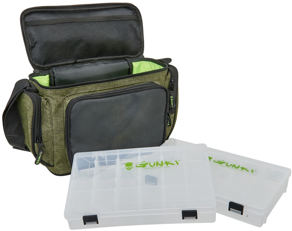 Taška pro uskladnění všeho potřebného na přívlač. Obsahuje velkou hlavní komoru na zip, tři menší vnější kapsy na zip a nastavitelný polstrovaný popruh přes rameno. Pevná odolná tkanina je doplněná o kvalitní zipy. To vše v Gunki designu. Součástí jsou i dvě krabičky na nástrahy o rozměrech 27,5x19,5x4,5 cm. Rozměr tašky: 29x13x21 cm.