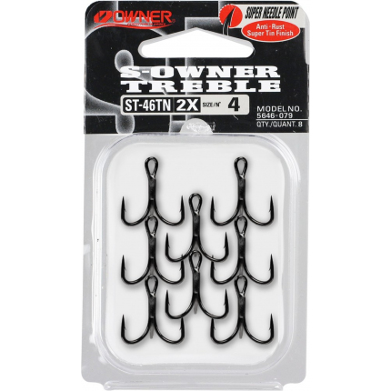 Owner ST-46 Stinger Treble - Black Chrome~Prémiové trojháčky typu Stinger Treble s unikátní čtyřdílnou konstrukcí - každé ramínko je samostatně spájeno pro maximální přesnost a rovnováhu. Očko je přivařeno přímo na vrchní části, což zajišťuje rychlejší a efektivnější zásek. Jsou vyrobeny z japonské oceli s antikorozní úpravou a extrémně ostrým hrotem typu Super Needle Point. Ideální pro přívlač, velké nástrahy i těžké podmínky. Skvělá volba pro intenzivní rybolov - odolné, přesné a ostré i po opakovaném použití.~Vlastnosti:~~· Materiál: japonská ocel~~· Trojháček ze 4 dílů - precizní vyvážení~~· Kovaný pro extra pevnost~~· Super Needle Point - chemicky ostřený hrot~~· Antikorozní úprava~~· Barva: Black Chrome