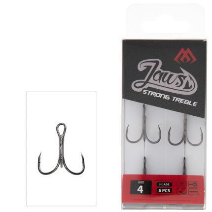Vysoko kvalitné, veľmi ostré a silné trojháčiky - rady JAWS. Krátky driečik minimalizuje riziko zamotania dvoch trojháčikov počas nahadzovania, zatiaľ čo zahnutý hrot zvyšuje účinnosť zdolávania. Navrhnuté pre lov trofejných rýb.