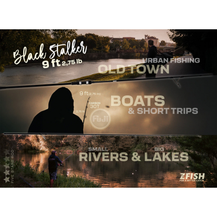 Na základe vašich žiadostí prinášame novú variantu nášho bestselleru – vytvorenú presne podľa vašich prianí. Nový Black Stalker je kratší a citlivejší, ale stále v sebe skrýva neuveriteľnú silu a odolnosť.Tento prút vás zaujme na prvý pohľad svojím elegantným čiernym dizajnom a kvalitnými komponentmi, ako sú luxusné očká od americkej značky Sea Guides a extrémne štíhla celo-duplonová rukoväť. Vyrobený z prvotriedneho karbónu 30T, prešiel Black Stalker náročným záťažovým testom, pri ktorom bez problémov uniesol až 8 kg záťaž, bez toho aby došlo k jeho poškodeniu – o tom sa môžete sami presvedčiť v našom testovacom videu.Prút je vybavený kvalitnými očkami – navádzacie očko má veľkosť 40 mm, špičkové 12 mm. K tomu pridávame osvedčené sedlo navijaka značky FUJI a praktický klip nad sedlom. Tento model je jednoducho neprekonateľný vo svojej cenovej kategórii. Technická špecifikácia: Dĺžka: 9ft (2,70m) Testovacia krivka: 2,75 lb Počet dielov: 2 Počet očiek: 6 Veľkosť špičkového očka: 12mm Veľkosť navádzacieho očka: 40mm Priemer blanku nad sedlom navijakov: 12mm Hmotnosť: 220g... Celý popis